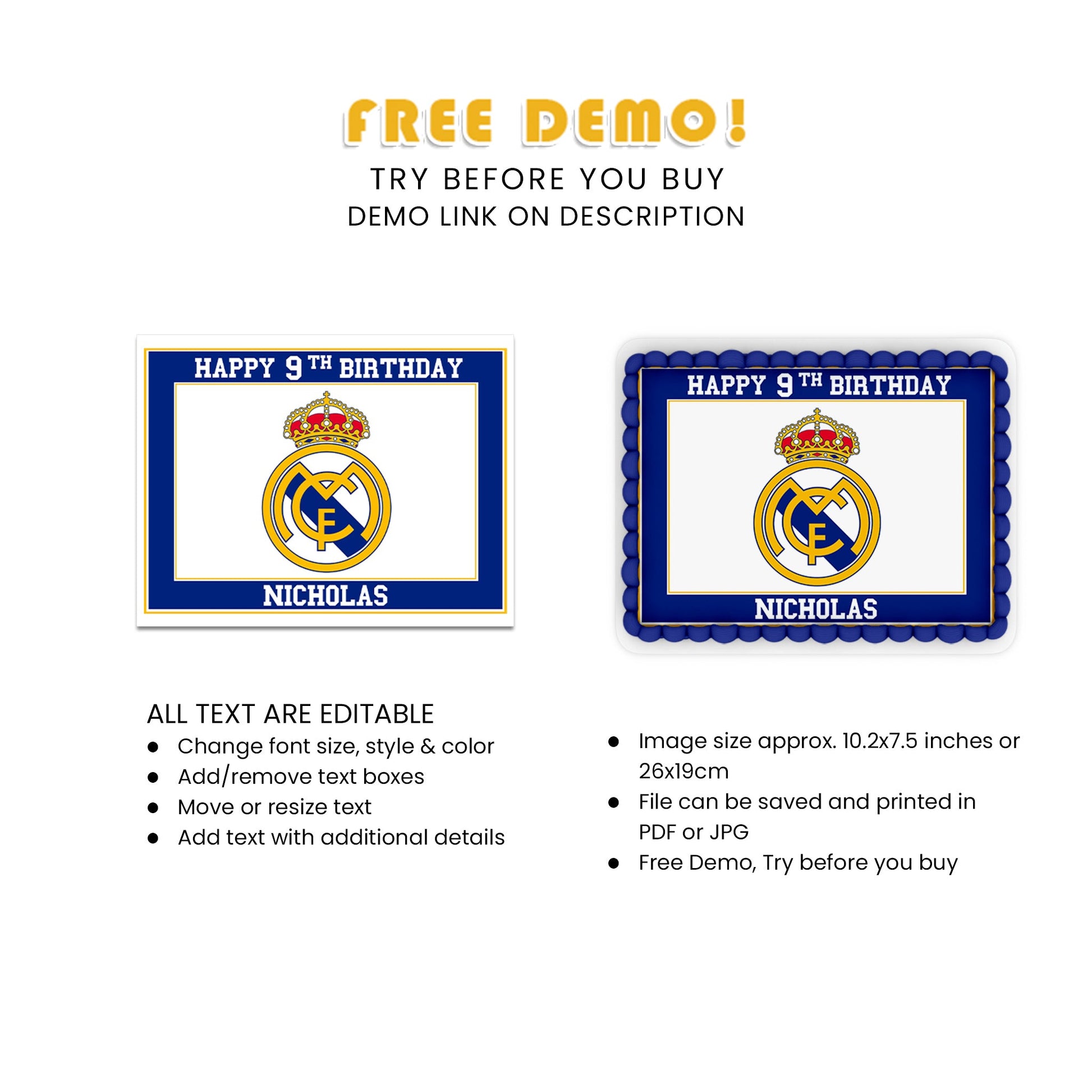Rectangle Real Madrid CF Personalized Cake Images. These images are perfect for any rectangular cake. Show your support for Real Madrid CF at your next party with these personalized cake images.