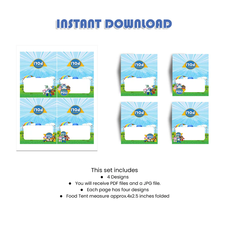 Label your food display with playful Robocar POLI food cards. Perfect for themed parties, these cards help guests navigate the spread while adding to the decor. Great for allergy notices, naming treats, or simply styling the table.