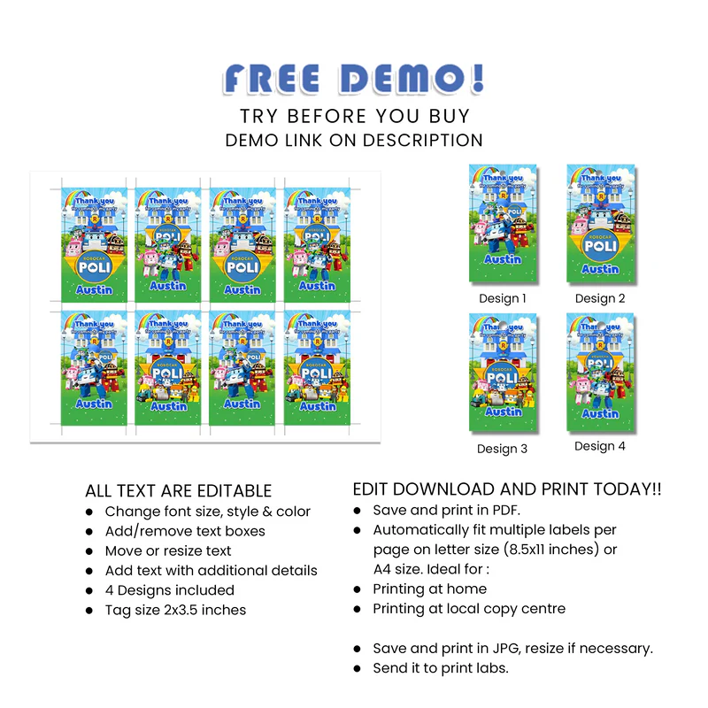 Robocar POLI Favor Tags - Custom Thank You Tags for Party Bags