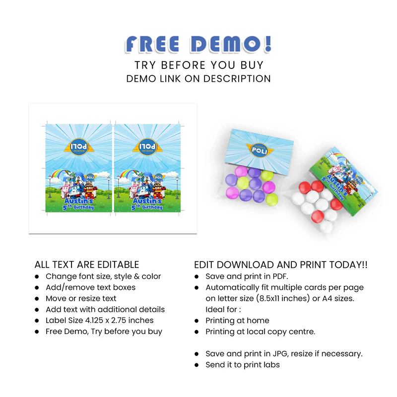 Robocar POLI Treat Topper - Custom Bag Header Label for Treats