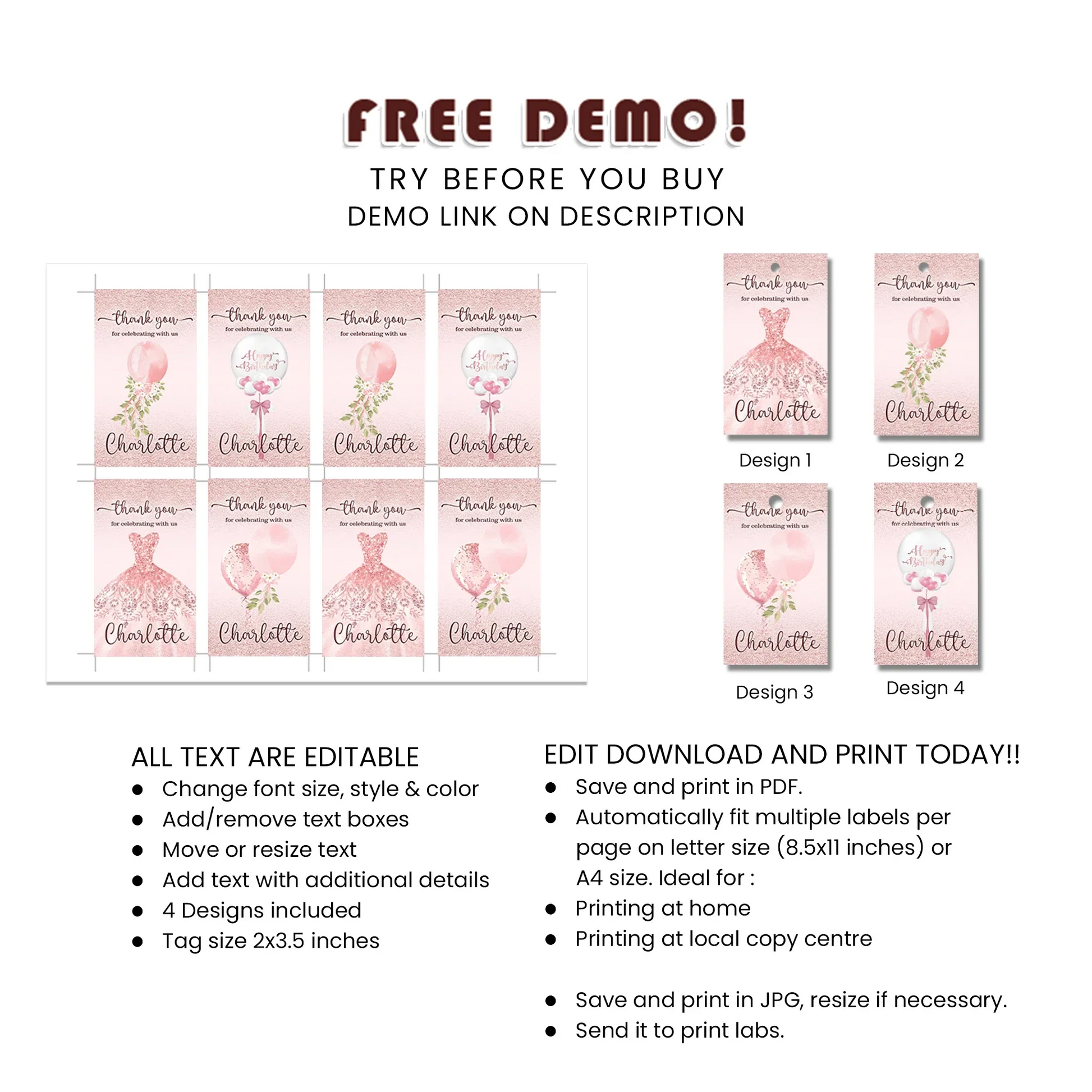 This Birthday Thank you Favor Tag is fully editable and available for immediate download. Our user-friendly online editor allows for easy customization without any software or font downloads.